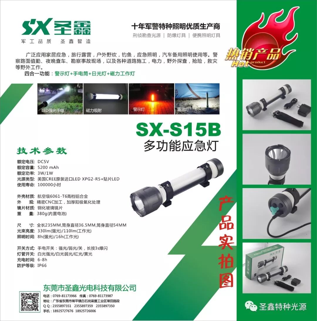 SX-S15便携式LED可用在交通警察路面值勤、夜晚查车、勘察交通事故现场,以及道路施工,抢险,救灾等。白光用来照明,红蓝爆闪光用来安全警示、保障执勤和作业人员人身安全。它可手提随身使用,调至红光闪烁时用2~3个就能在执勤现场设置一个主动警示的安全区域。